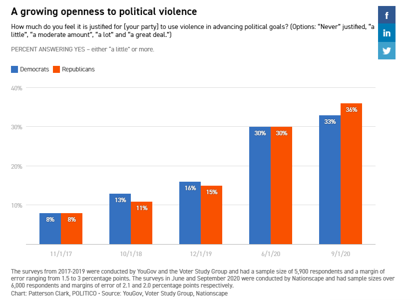 October 2, 20205 yr https://www.politico.com/news/magazine/2020/10/01/political-violence-424157 Quote Americans Increasingly Believe Violence is Justified if the Other Side Wins These numbers are even higher among the most ideological partisans. Of Democrats who identify as "very liberal,” 26 percent said there would be "a great deal” of justification for violence if their candidate loses the presidency compared to 7 percent of those identifying as simply "liberal.” Of Republicans who identify as "very conservative,” 16 percent said they believe there would be "a great deal” of justification for violence if the GOP candidate loses compared to 7 percent of those identifying as simply "conservative.” This means the ideological extremes of each party are two to four times more apt to see violence as justified than their party’s mainstream members.