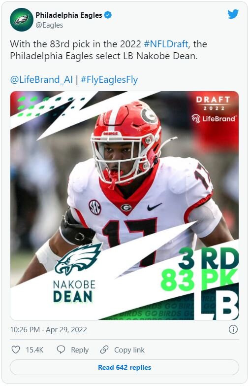 Posted April 30, 20223 yr Eagles Add a Star LB Posted: April 29th, 2022 | Author: Tommy Lawlor Nakobe Dean had a great season for Georgia, helping them to win the national championship. He was expected to be drafted in the first or second round. Dean slid down the proverbial draft board and the Eagles generously ended his slide. Love it. Dean is a high character player and team leader. He was the heart and soul of Georgia’s amazing defense. He is an outstanding student and a guy that people just rave about it. As a player, Dean is a stud LB. He has terrific instincts and outstanding range. He is a physical hitter and tackler. He has solid cover skills. Dean is only 5-11, 229 and that’s not ideal size. He’s not an elite athlete. He is just a damn good football player who showed up every week and made a ton of key plays. Why the slide? Teams were concerned with some injury issues, most notably a pec injury. Dean elected not to have surgery, preferring to try physical therapy. Apparently that decision bothered some teams. There is a question about whether Dean will be healthy for the upcoming season or will need to have the surgery that he put off. There is risk. But I’m fine with that because of the potential upside. Dean could play MLB or WLB for the Eagles. He could become a key leader for the defense. If he can stay healthy, Dean can be the best LB the Eagles have had in a while. http://igglesblitz.com/2022/04/eagles-add-a-star-lb/ CLICK ON LINK TO ARTICLE TO VIEW VIDEOS