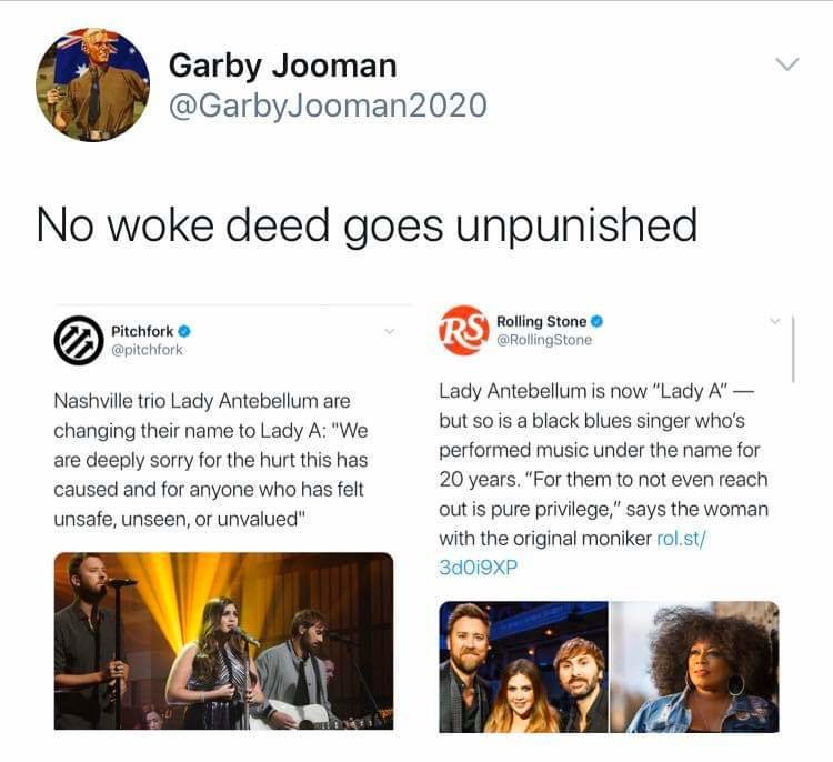 June 11, 20205 yr 20 minutes ago, NOTW said: They've actually been called Lady A for short for years anyway. I met someone at a party who worked for their record label and "discovered" them doing a live show and signed them to their record label. This had to be like 8 years ago or something. She called them Lady A. 20 minutes ago, Mike030270 said: Yea but people don't like being told what to do lol
