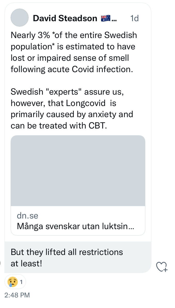 October 25, 20213 yr 2 minutes ago, DrPhilly said: I saw the headline of that article but hadn't read it, until now. The tweet was partially accurate. The article doesn't say that 3% of the population is experiencing a lessening of sense of smell due to COVID. What it says is that approx. 3% are reporting a lessened sense of smell and that the majority of those believe it is COVID related and not due to other symptoms. Also, while the article talks about CBT as a known treatment, it doesn't say anything about anxiety being the main cause of the problem. Typical weak spin. Mostly Munson and I just talk about Sweden, the pandemic, and the pandemic in Sweden.