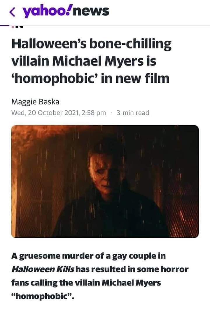 October 26, 20213 yr 7 minutes ago, NOTW said: https://www.google.com/amp/s/uk.news.yahoo.com/amphtml/halloween-bone-chilling-villain-michael-185822468.html He’s an equal opportunity serial killer. His refusing to murder them because they’re ghey would make him homophobic, which would be way worse than treating them like everyone else and brutally killing them.