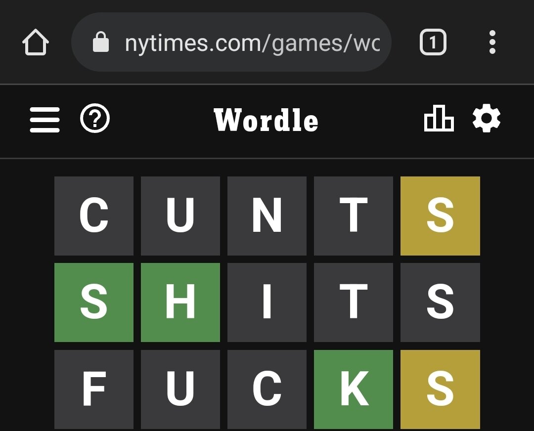 February 17, 20223 yr 17 hours ago, NOTW said: Global fun word game started in England, bought by NYT who start censoring words. Decided to test their censored words. You know what isn't censored? (And it actually helped me solve it).
