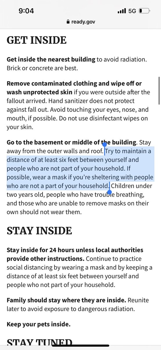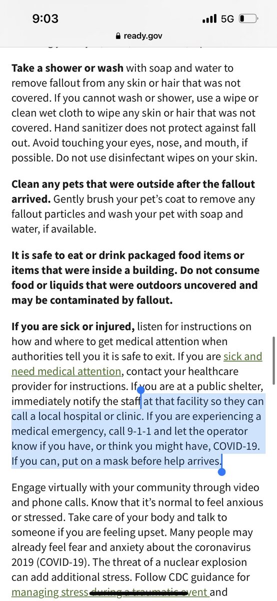 February 28, 20223 yr Author FEMA just updated their Nuclear Explosion Survival Guide to include Social Distancing and Masking requirements "The threat of nuclear explosion can add additional stress" 🤣🤣🤣🤣🤣🤣