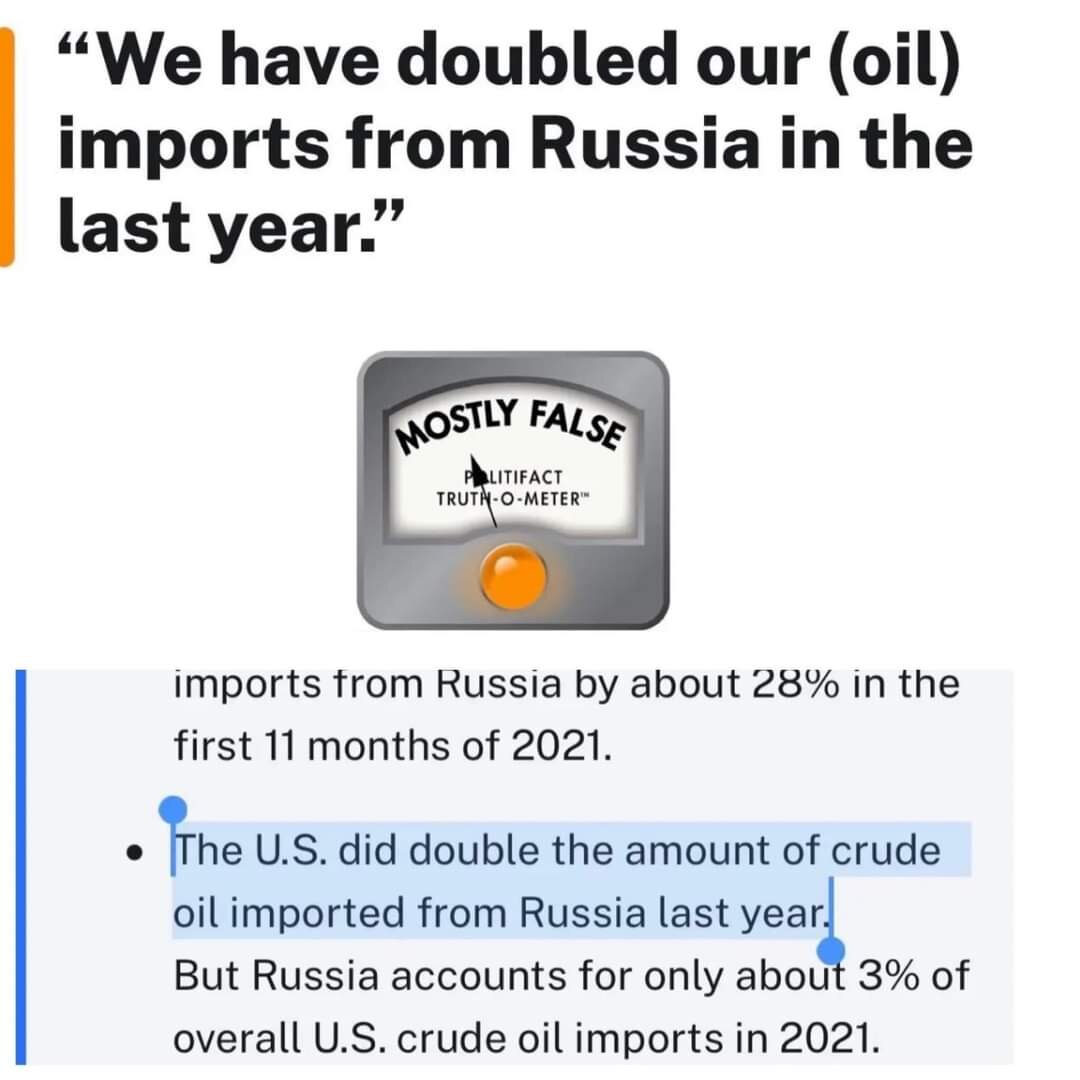 March 2, 20223 yr 17 hours ago, RPeeteRules said: I enjoy reading fact checks sometimes as it’s fun to see how a quote that is true can be twisted to be false. It’s like a stat, you can make it true, false, and say almost anything you want it to say. This is a weird one, because it's a situation where a news personality is exaggerating a situation for effect. https://www.politifact.com/factchecks/2022/feb/28/maria-bartiromo/us-did-not-double-oil-imports-russia-last-year/ Depends on what do you mean by "oil imports?" If you mean crude, yeah it doubled. But overall the crude amount is small. Russia's refinery capacity is high, so then majority of what we import is refined, and overall it went up 28%. It was up. Because oil (petroleum) is a global market and US consumers would be dumb not to take the best price. But you need to laser in on crude to be able to say it doubled.