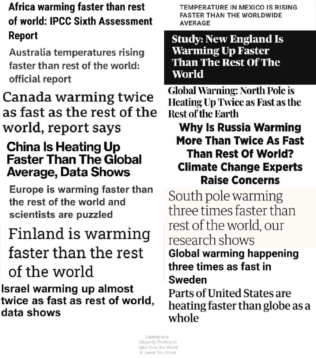 August 3, 20223 yr Author Africa: https://www.downtoearth.org.in/news/africa/africa-warming-faster-than-rest-of-world-ipcc-sixth-assessment-report-78424 Australia: https://www.reuters.com/article/us-australia-climatechange-idUSKBN0L02P820150127 Canada: https://www.bbc.com/news/world-us-canada-47754189 China: https://www.bloomberg.com/news/articles/2020-08-27/china-is-heating-up-faster-than-the-global-average-data-shows Europe: https://www.space.com/europe-climate-warming-faster-than-world Finland: https://www.helsinkitimes.fi/world-int/world-news/finland-in-the-world-press/13155-finland-is-warming-faster-than-the-rest-of-the-world.html Israel: https://www.ynetnews.com/environment/article/rjdyrxt8f Mexico: https://www.vallartadaily.com/temperature-in-mexico-is-rising-faster-than-the-worldwide-average/ New England: https://www.cbsnews.com/boston/news/new-england-warming-climate-change-study-massachusetts/ North Pole: https://www.news18.com/news/buzz/global-warning-north-pole-is-heating-up-twice-as-fast-as-the-rest-of-the-earth-3159197.html Russia: https://www.ibtimes.com/why-russia-warming-more-twice-fast-rest-world-climate-change-experts-raise-concerns-2240034 South Pole: https://www.theguardian.com/environment/2020/jun/30/south-pole-warming-three-times-faster-than-rest-of-the-world-our-research-shows Sweden: https://metro.co.uk/2021/10/27/global-warming-happening-three-times-as-fast-in-sweden-15494268/ United States: https://www.theguardian.com/environment/climate-consensus-97-per-cent/2017/jan/17/parts-of-united-states-are-heating-faster-than-globe-as-a-whole