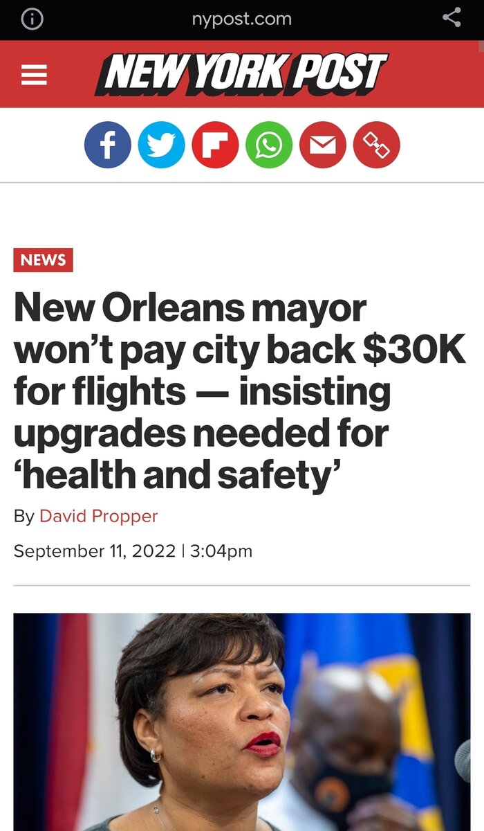 September 14, 20223 yr https://nypost.com/2022/09/11/nola-mayor-latoya-cantrell-defends-expensive-flight-costs/