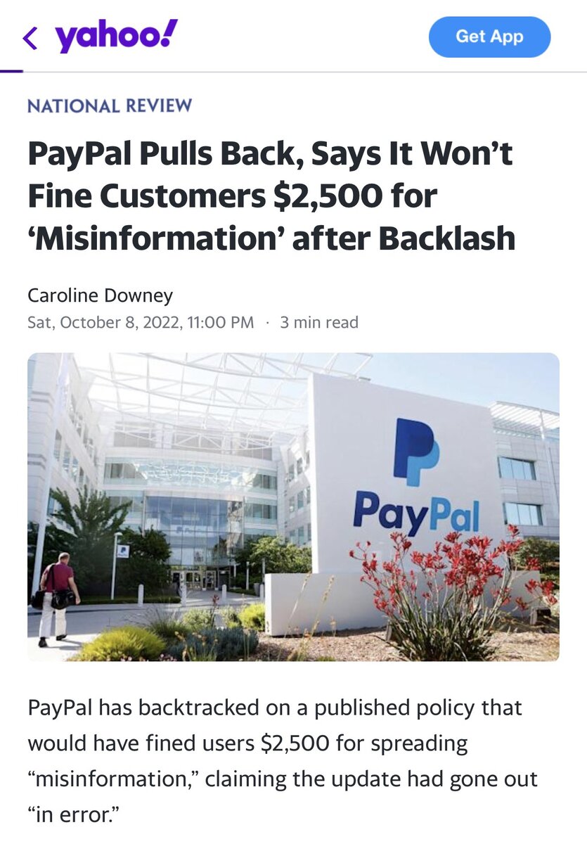 October 9, 20223 yr Author https://news.yahoo.com/paypal-policy-permits-company-fine-143946902.html The fact that this statement was drafted, means that they are planning on doing it and I wouldn't be surprised if it wasn't at the behest of the government. Do you realize how many people had to be consulted and how many lawyers probably worked on putting that together? This isn't an "opps, someone accidentally typed that" type of thing. Of course, the CEO is connected to the WEF... If you don't think China-style Social Credit System is coming here, you're insane.