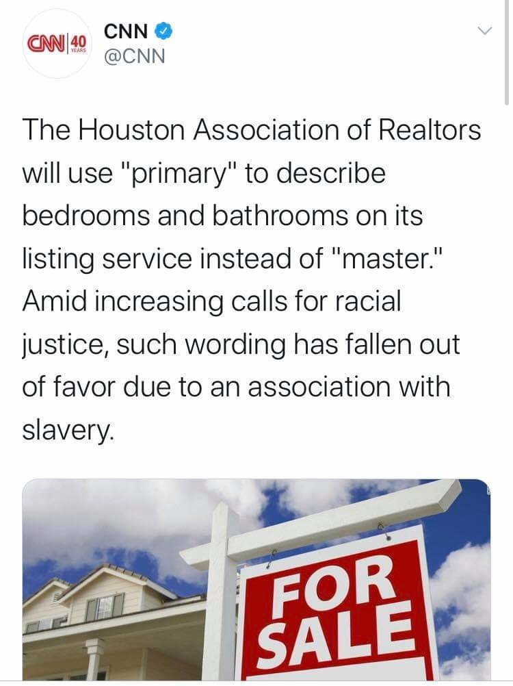 June 26, 20205 yr https://www.newsweek.com/texas-realtors-remove-master-bedroom-descriptions-1513803 https://www.cnn.com/2020/06/25/us/master-houston-association-of-realtors-trnd/index.html