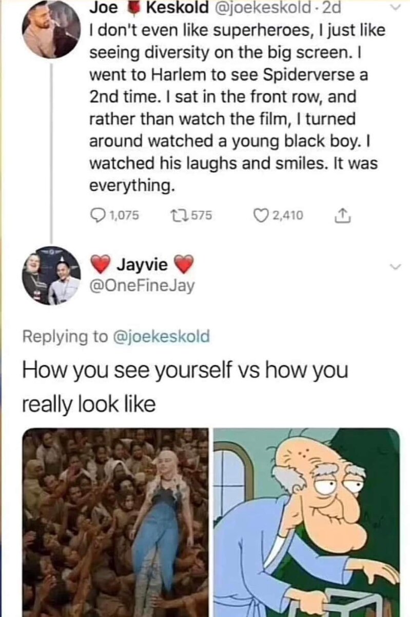 January 7, 20232 yr "Kiddo can move and combine these in any way, any time of day, as much or as little, as they want." What right-wingers need is a deep fake that changes pronouns so frequently that it becomes an SNL skit. "My pronouns are he/him." "Oh, I'm sorry, sir, it won't happen again." "Please don't call me sir. I changed my pronouns to she/her now." "I'm sorry, maam." "It's he/him now." "Got it, sir." "I'm both a man and a woman now. I go by they/them." "Okay." "My fluidness says I'm a woman now. I go by she/her."