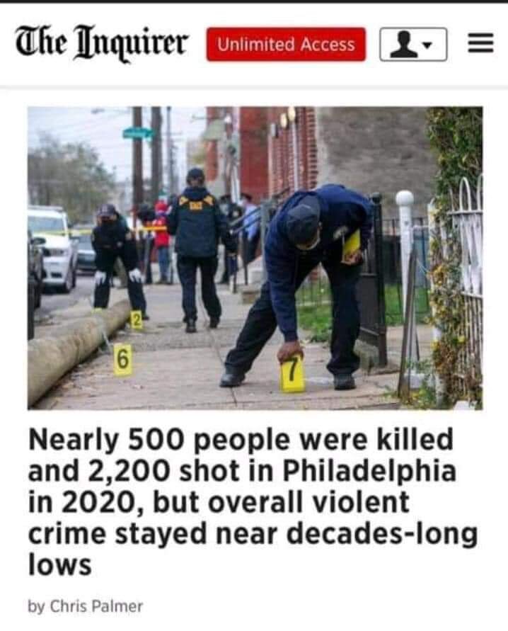 January 1, 20232 yr Author This is hilarious..... "Overall violent crime" is at a near "decades-long low" because police aren't responding to calls and/or charges are getting downgraded from armed robbery/aggravated assault to simple theft or simple assault, which doesn't count toward "violent crime" numbers. Even the murder number is way off.... My buddy is a homicide detective in Philly and he said the real number is closer to 600,but since so many jobs were classified as "Suspicious" instead of a homicide, and since the ME is so backed up due to the amount of overdose autopsies, most of them don't get processed until after they close the book on the yearly stats. I know 2 people who were mugged, called 911 and no one ever showed up to take down a report and they never bothered going to the station to file one. Only Philadelphia Weekly had the balls to actually report on this in the past, so I'm not surprised that the Inquirer is parroting the Party line https://philadelphiaweekly.com/suspicious-deaths/