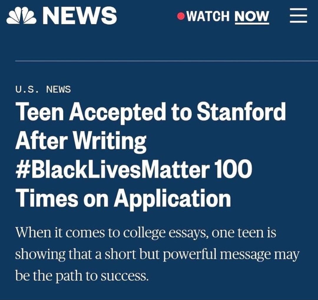 February 18, 20232 yr 4 hours ago, iladelphxx said: https://www.nbcnews.com/news/us-news/teen-accepted-stanford-after-writing-blacklivesmatter-100-times-application-n742586 A 2017 story