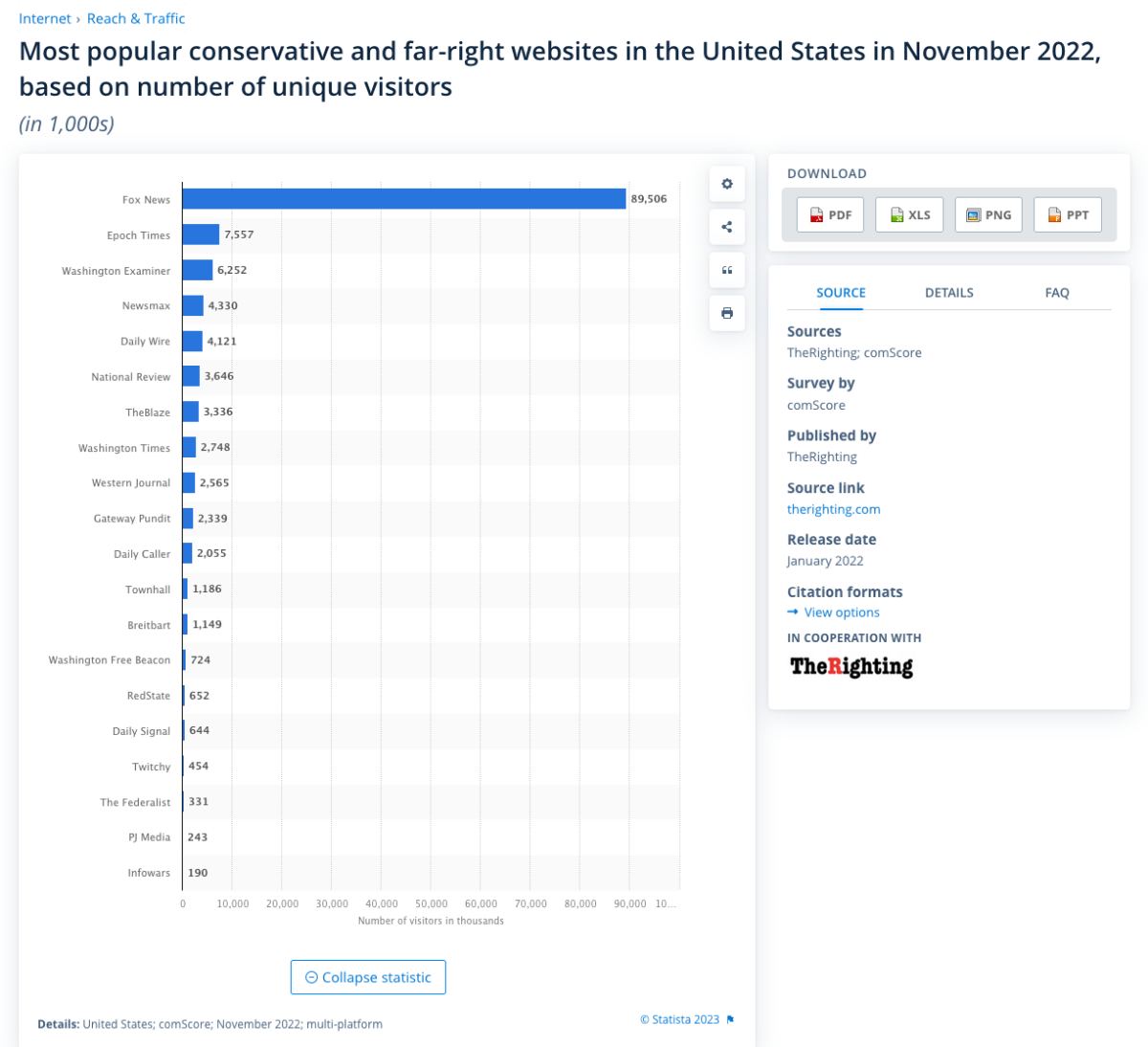 February 20, 20232 yr 33 minutes ago, CountBlah said: LOTS of people to focus on the ONE MSM outlet that leans right. This is funny for a couple reasons, but you keep saying they're the one mainstream media outlet. But what are you talking about? Most people get their news online in 2023, not from the dinosaurs on TV. And there are endless right wing websites/"news organizations" out there. They may not seem like they're "mainstream" but that's because right wingers prefer Fox New's website. Look at these numbers: That's an absolute beat down. They get well over 10 times the traffic of their closest competitor. But there's no lack of outlets. Republicans just prefer to get their media from one singular corporate conglomerate. So, yeah, if an entire political party is going to willingly drink from the exact same trough, then that source should be scrutinized more than any other outlet on either side.