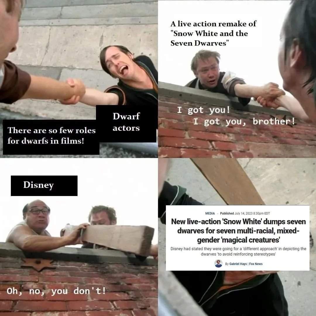 July 18, 20232 yr Author Holy crap..... This is my new favorite story. The Daily Mail posted pictures of the new live action snow white movie that looked hilariously woke (Snow White has brown skin instead of being, um, Snow White and 6/7 "dwarves" were normal sized people, including a women and half were non-white.) Disney said they were fake. The left dunked on the Daily Mail for publishing "obviously fake" pictures.... Disney later revealed that they were real pictures of the cast, just not "official" pictures
