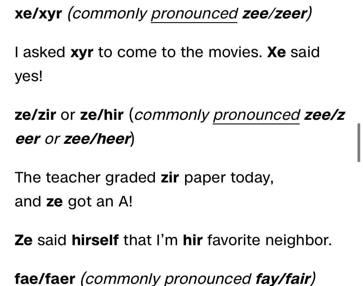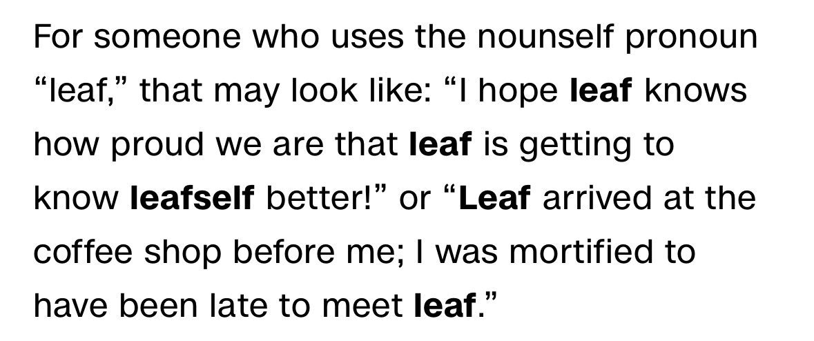 August 14, 20232 yr Here's more: Quote An intro to nounself neopronouns Leaf, sun, star — nounself pronouns are neopronouns that use nature and other inspirations as nonbinary or genderless descriptors. Linguist Jason D’Angelo told The New York Times that nounself pronouns were popularized on the social platform Tumblr around 2012 and 2013 and remain in use among members of fandoms who may take their nounself pronouns from the properties they enjoy. For someone who uses the nounself pronoun "leaf,” that may look like: "I hope leaf knows how proud we are that leaf is getting to know leafself better!” or "Leaf arrived at the coffee shop before me; I was mortified to have been late to meet leaf.” In a 2016 paper on the emerging pronouns, Danish linguist Ehm Hjorth Miltersen wrote that nounself pronouns offer a way for people to establish identity beyond just gender. By finding one’s desired nounself pronouns, one can "can construct new ways to identify and be perceived by others that are more coordinate with complex and diverse identities.” Miltersen wrote that one nounself pronoun user who responded to their questionnaire wrote that they sometimes use "pup/pupself” pronouns to "express a level of fun, happiness and excitement … in me.” Some critics of nounself pronouns feel that the words sound "silly” or "make it harder for transgender and nonbinary people to be taken seriously” since the terms are often much newer and less commonly used than other pronouns, Miltersen said. Baron noted, though, that all words, in any language, were "invented” at one point. "Like it or not, lots of new words pop up every day,” Baron said.