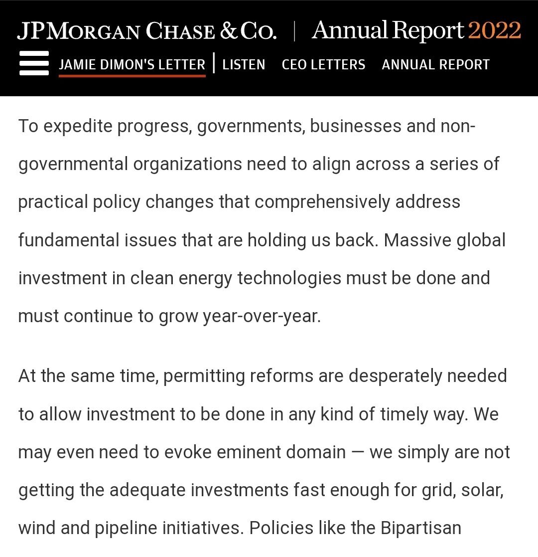 September 25, 20232 yr 11 hours ago, JohnSnowsHair said: I'm gonna go out on a limb and say the site that reported this - which also has the headline "TRENDING: CIA Agent Confesses: We Created ‘Adrenochrome Farms’ Where MILLIONS of Kids Are Sold to VIPS" - may be .... I dunno, exaggerating their claim a little? It's only well known that this is from his letter to shareholders. https://reports.jpmorganchase.com/investor-relations/2022/ar-ceo-letters.htm Quote CLIMATE COMPLEXITY AND PLANNING The window for action to avert the costliest impacts of global climate change is closing. At the same time, the ongoing war in Ukraine is roiling trade relations across Europe and Asia and redefining the way countries and companies plan for energy security. The need to provide energy affordably and reliably for today, as well as make the necessary investments to decarbonize for tomorrow, underscores the inextricable links between economic growth, energy security and climate change. We need to do more, and we need to do so immediately. To expedite progress, governments, businesses and non-governmental organizations need to align across a series of practical policy changes that comprehensively address fundamental issues that are holding us back. Massive global investment in clean energy technologies must be done and must continue to grow year-over-year. At the same time, permitting reforms are desperately needed to allow investment to be done in any kind of timely way. We may even need to evoke eminent domain — we simply are not getting the adequate investments fast enough for grid, solar, wind and pipeline initiatives. Policies like the Bipartisan Infrastructure Law, the Creating Helpful Incentives to Produce Semiconductors (CHIPS) and Science Act, and the Inflation Reduction Act (IRA) — that hold the potential to unlock over $1 trillion in clean technology development — need to be implemented effectively. The upside is undeniable: Widespread investing across the private sector will aid domestic manufacturing, invigorate research and development in green innovation, help create resilient supply chains, lift up local economies and build the U.S. clean energy workforce by up to 9 million jobs over the next decade. While major advances have been made in the last few years on technology to help this cause, we are hopeful that the great American innovation machine (most advancements will ultimately come from the huge capabilities and capital of America’s largest companies) will find the additional technologies that are desperately needed. There is a downside — massive, inefficient and malinvestment of capital. I talk more about this in the last section on public policy. Polarization, paralysis and basic lack of analysis cannot keep us from addressing one of the most complex challenges of our time. Diverse stakeholders need to come together, seeking the best answers through engagement around our common interest. Bolstering growth must go hand in hand with both securing an energy future and meeting science-based climate targets for future generations.