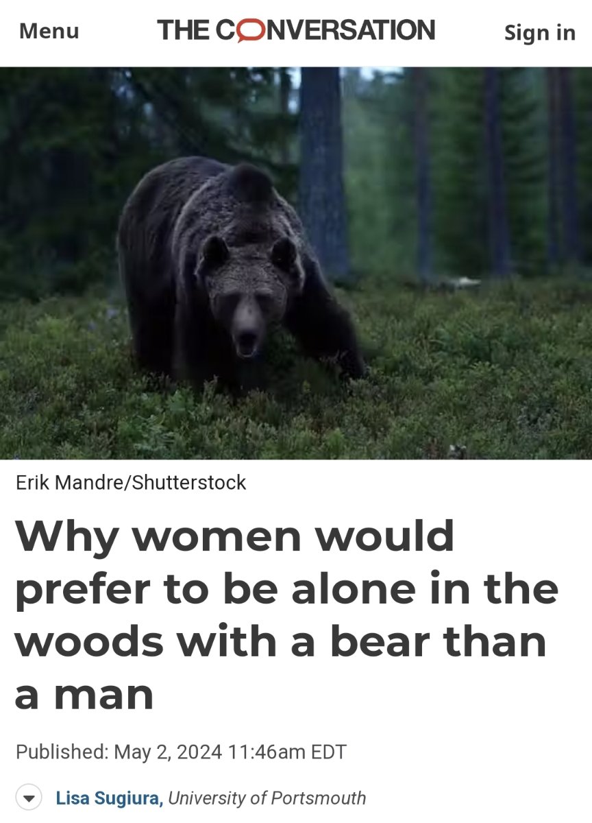 May 6, 20241 yr You’ll rarely hear a woman who was alone in the woods with a bear complain about it afterwards.