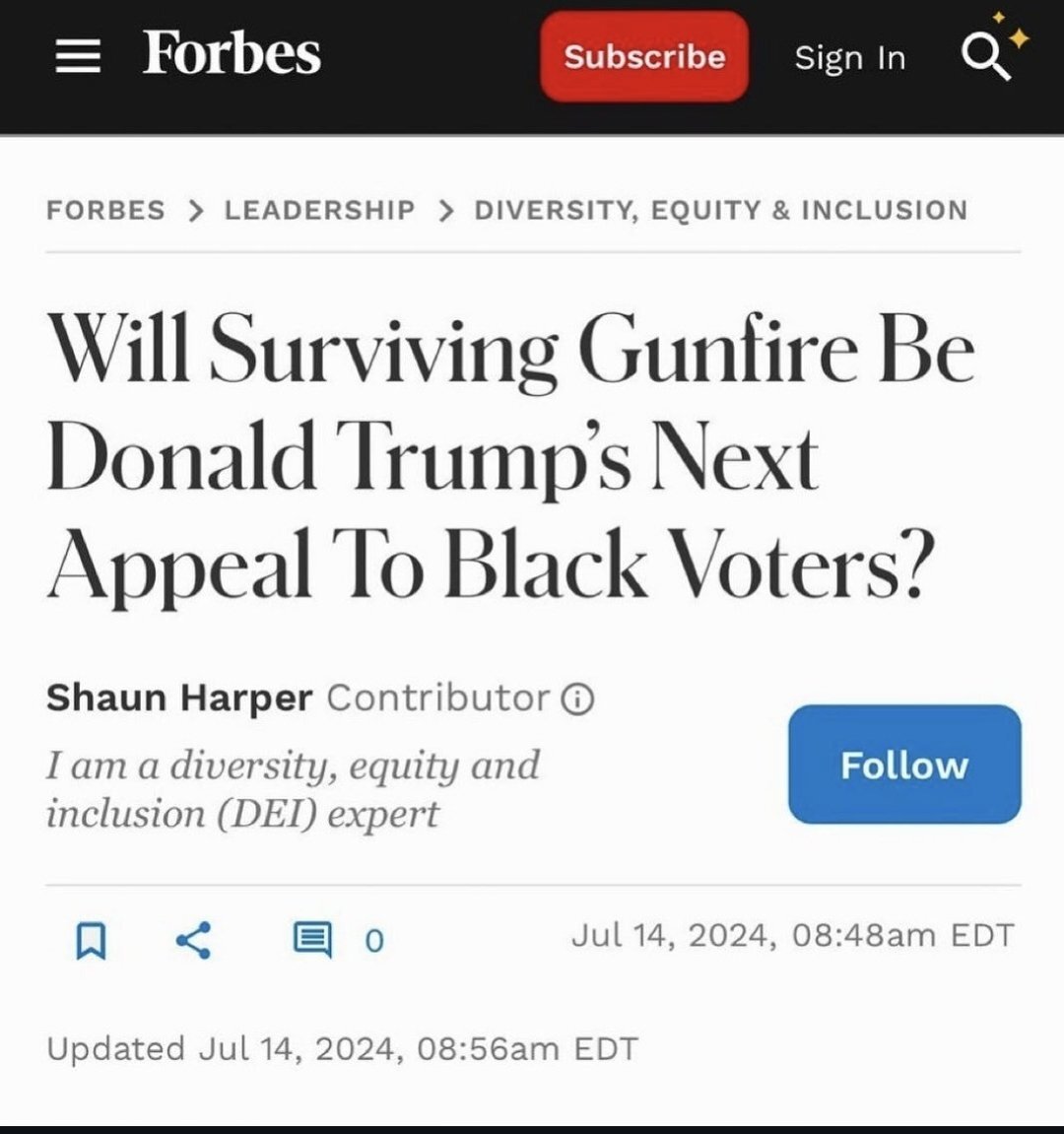 July 14, 20241 yr Author https://www.forbes.com/sites/shaunharper/2024/07/13/will-surviving-gunfire-be-donald-trumps-next-appeal-to-black-voters/