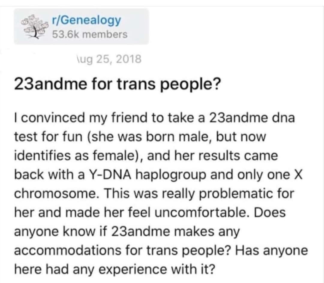 October 27, 20241 yr 12 hours ago, iladelphxx said: This is an excellent point. Mutilating yourself impacts your chromosomes. 23andMe really needs to fix their systems.