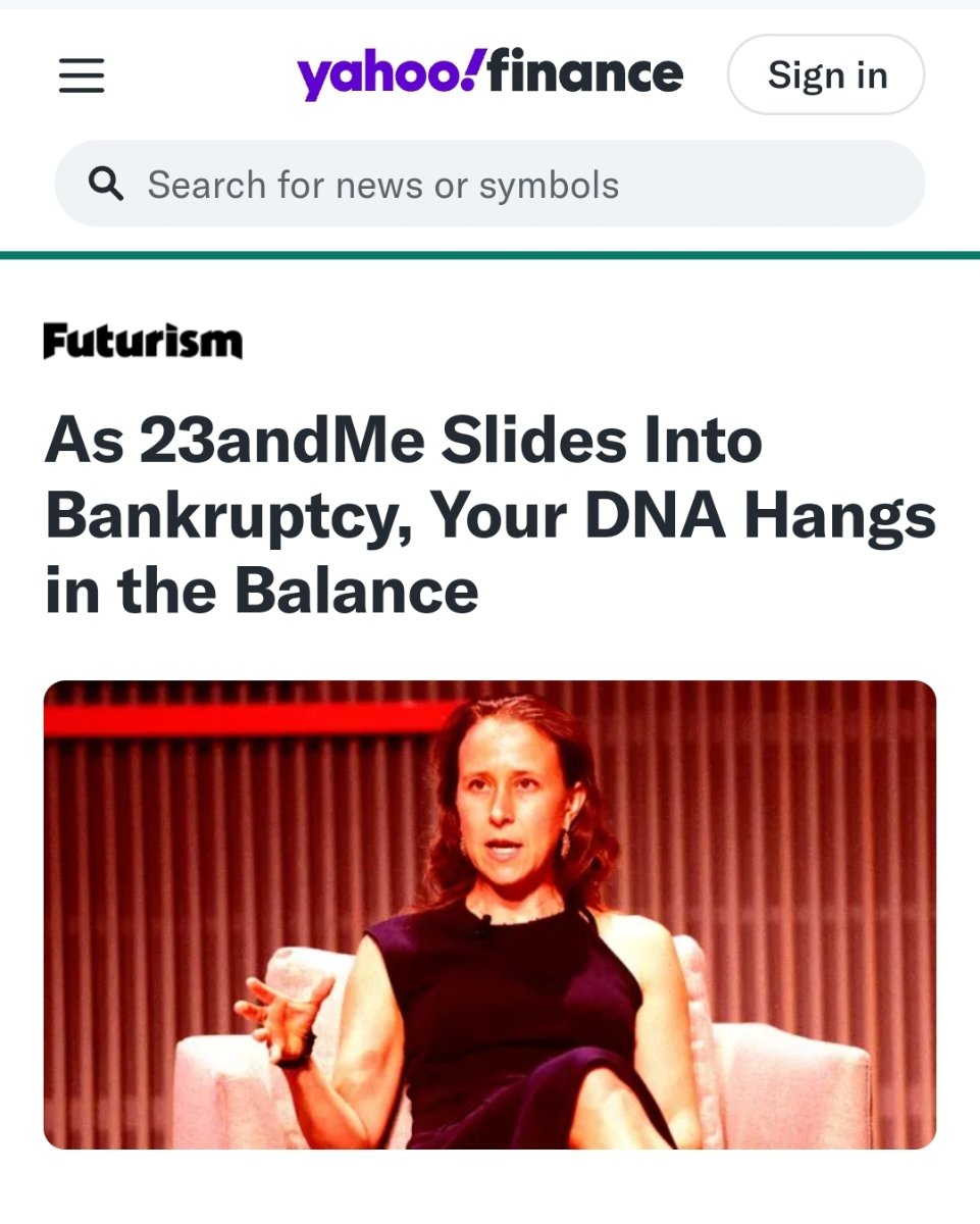 October 27, 20241 yr 3 hours ago, iladelphxx said: As 23andMe Slides Into Bankruptcy, Your DNA Hangs in the Balance
