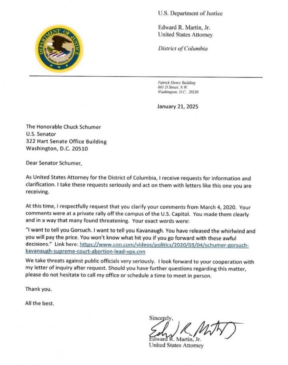 February 3Feb 3 BREAKING: Chuck Schumer in hot water! US Attorney Ed Martin has sent a letter to Schumer about his threats towards conservative Justices, specifically Gorsuch and Kavanaugh. "We take threats against public officials very seriously. I look forward to your cooperation with my letter of inquiry after request."- Martin