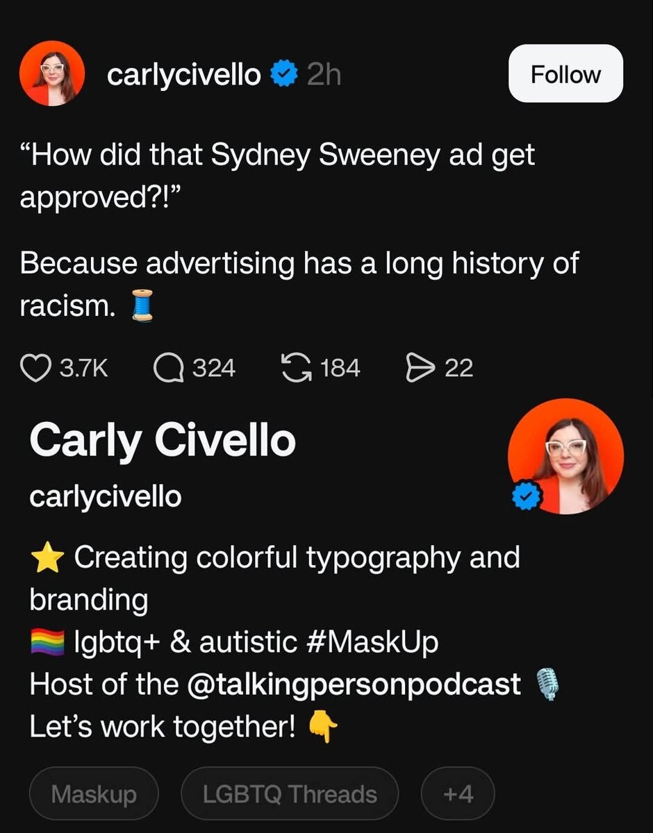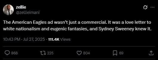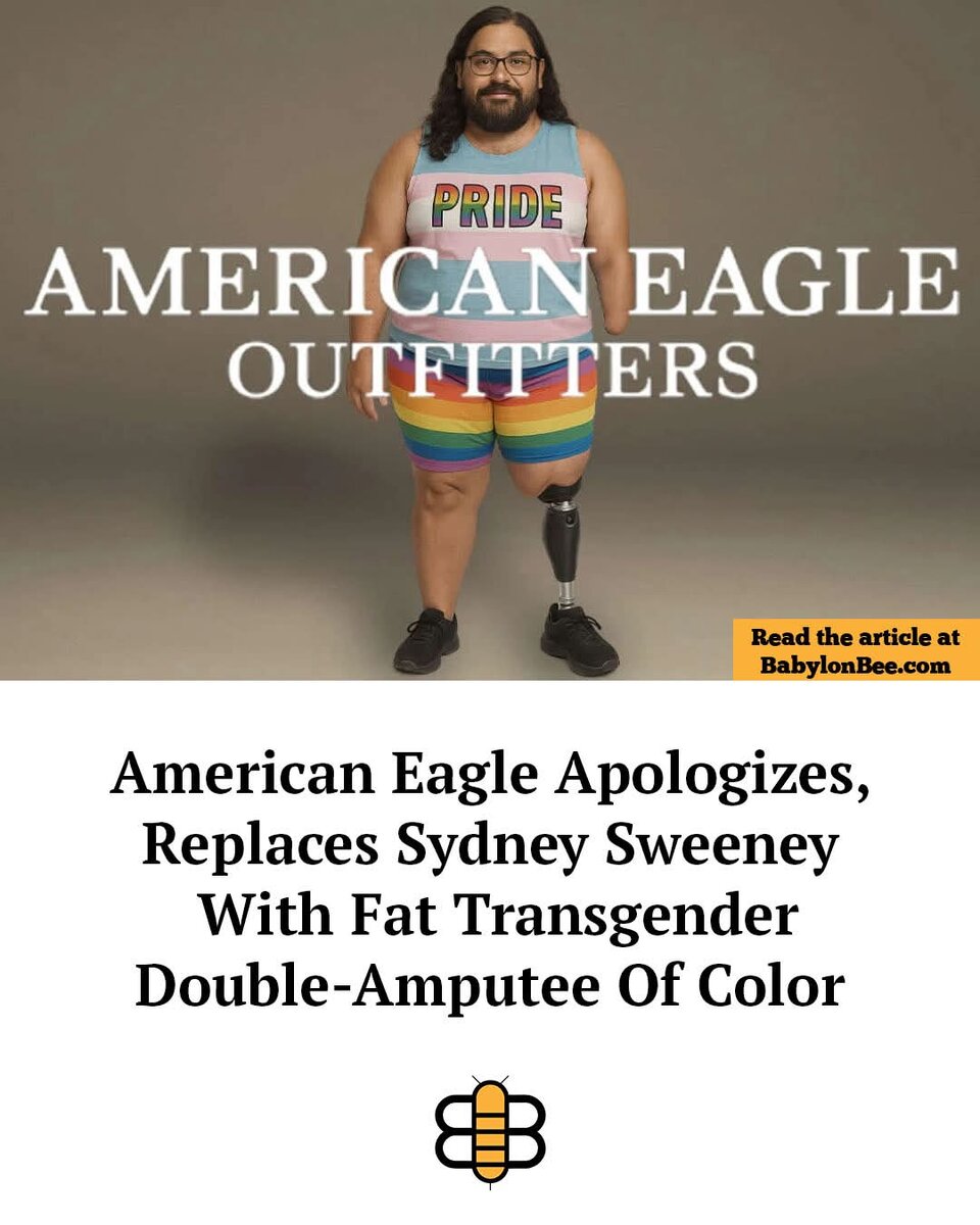 July 30Jul 30 Personally, I welcome SydneySweeneyGate. Thanks to the puritanical ramblings of Democrats they've been showing the ads non-stop on the news for days now. Please, keep complaining.