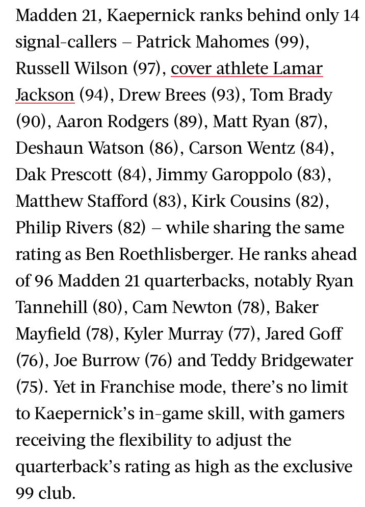 September 8, 20205 yr 2 hours ago, Dawkins 20 said: EA added Kaepernick to Madden '21 and apparently has him as the 15th ranked QB. https://theundefeated.com/features/colin-kaepernick-returns-to-madden-for-first-time-since-2016/ Stunning and brave. the entire article is laughable.