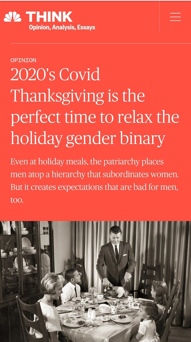 November 27, 20204 yr Searching for news on Thanksgiving COVID, this opinion piece was the 2nd result. Dismantle the patriarchy this Thanksgiving. https://www.nbcnews.com/think/opinion/2020-s-covid-thanksgiving-perfect-time-relax-holiday-gender-binary-ncna1248999