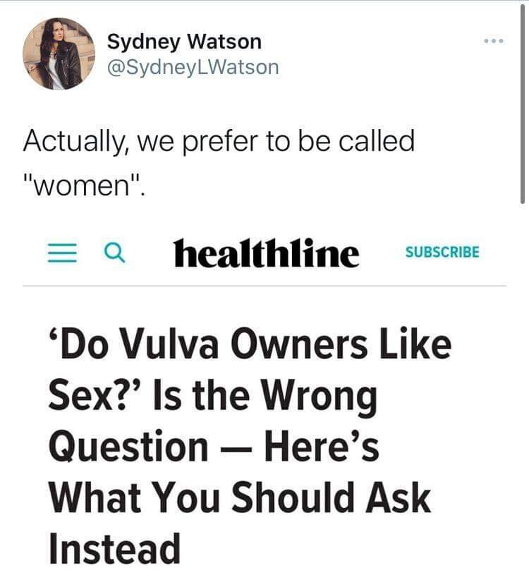 December 3, 20204 yr 3 hours ago, NOTW said: https://www.healthline.com/health/healthy-sex/do-women-like-sex 2019: Front hole 2020: Vulva owners Men can have vagines, too!
