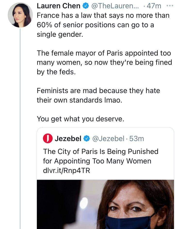 December 17, 20204 yr 4 minutes ago, NOTW said: Apparently the fine will go towards getting more women into public service. Kind of ironic that getting more women into senior positions of public service gets hit with a fine that will go towards getting more women into public service.