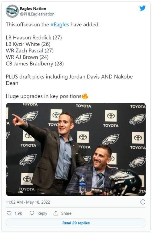 Posted May 19, 20223 yr ‘Dominant Defense’: Eagles Players Respond to James Bradberry Signing By Mike Greger Updated May 18, 2022 at 4:33pm Getty: Eagles CB Avonte Maddox returns an interception down the sideline in 2021 versus the New York Giants. The addition of James Bradberry changes expectations for the Philadelphia Eagles’ defense. The squad went from not knowing who might play opposite Darius Slay to getting a Pro Bowl cornerback. That one roster move, coupled with a stellar draft class, could turn the unit into one of the most feared in football. The excitement was buzzing about Bradberry on Wednesday afternoon at the team’s practice facility. Avonte Maddox found out about the signing from his teammates as he walked into the locker room. The smile on the nickel cornerback’s face said it all. "I walked into the locker room and I didn’t even know about it because I didn’t have my phone or anything like that,” Maddox told reporters. "Then I seen a few guys just talking about it and then I looked at my phone and I seen it, so pretty cool. Like I said, high praise for the player and the guy so I’m excited to work with him.” Maddox — the 26-year-old who inked a three-year extenion in 2021 — sees a "dominant defense” ready to bust out in 2022. In addition to Bradberry, the team added pass rusher Haason Reddick, linebacker Kyzir White, plus rookie defensive tackle Jordan Davis and rookie linebacker Nakobe Dean. Watch out. "We want to be dominant, that’s the goal every year going into any season from my standpoint,” Maddox said. "The main two goals are: takeaways — and that’s the biggest one — and stopping the explosive plays. We’re going to go in and we’re going to focus on our goals and everyone has their individual goals but coming in as a defense, and adding all these pieces and even with the young guys, I feel like we have good depth in this room and on this defense to be a dominant defense.” Quez Watkins Loves Bradberry’s Size Bradberry brings 15 career interceptions into the Eagles’ revamped secondary. Yes, the 28-year-old is coming off a down year in 2021 but he is only one season removed from a Pro Bowl apperance. And his 82 pass breakups since 2016 are the second-most in the NFL to only one player, Darius Slay and his 84 pass breakups. Bradberry — standing at 6-foot-1 and 212 pounds — instantly upgrades the Philly secondary. "He brings a lot of size and then with him he’s a great corner. He’s a top corner in this league,” Quez Watkins said. "So he’s going to bring a different aspect to the DBs and to the DBs room. He’s going to bring that competitiveness.” Maddox has watched Bradberry’s tape and knows what kind of player the Eagles just stole away from their NFC East rivals. "He’s a great player obviously, and he’s been playing the game for a minute,” Maddox said, "and he’s smart and he knows the game well. So, just adding a piece like that to the defense is a great addition.” T.J. Edwards Not Scared of Competition The linebackers room in Philadelphia arguably saw the greatest upheaval this offseason. The additions of Haason Reddick and Kyzir White should turn a relative weakness into a strength, a group that returning starter T.J. Edwards is proud to lead into battle. Competition at the position is only going to make everyone stronger. "It’s awesome. I think the more depth you have, the more piecese you have, the more you can do,” Edwards said. "I think we’ve brought in some really good additions and guys that have really played football at a high level, so I think it just adds more to what we can do. I think that, and you look at it as competition, everyone’s going to get better from that.” https://heavy.com/sports/philadelphia-eagles/james-bradberry-dominant-defense/