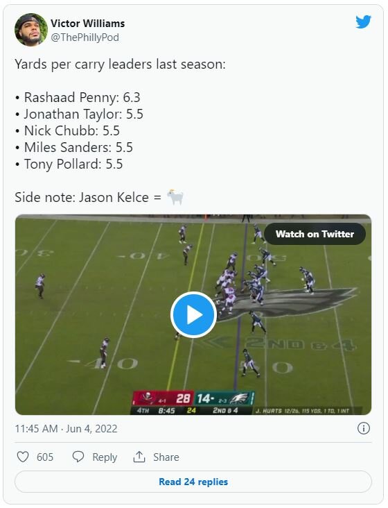 June 13, 20223 yr On 6/8/2022 at 11:40 AM, time2rock said: ROSTER OUTLOOK: PROJECTED CONTRACT FOR MILES SANDERS REVEALED By Victor Williams June 7, 2022 After switching up their playbook midseason, Nick Sirianni and the Eagles became the league’s most effective team on the ground. With dual-threat QB Jalen Hurts leading the charge, Philadelphia finished the year first in total rushing yards and rushing yards per game. Even after adding star WR AJ Brown, Philly should continue to be dominant on the ground in 2022 behind the best offensive line in football. The Eagles lead-back, Miles Sanders, is entering the final year of his rookie deal with extra motivation, having sustained several injuries over the last two seasons. So for the Eagles, the question becomes what is Miles Sanders worth? Spotrac recently calculated Sanders’ market value based on age, statistical production, and comparable players. Market Value 3 yrs, $12,766,680 Avg. Salary: $4,255,560 NFL Rank: 423 RB Rank: 19 Rush yards/game Length Value Avg. Salary Age when signed Chris Carson 70.7 2 $10.4M $5.2M 26 James Connor 51.5 1 $1.75M $1.75M 25 Kenyan Drake 61.1 2 $11M $5.5M 27 Phillip Lindsay 56.0 1 $3.25M $3.25M 26 Miles Sanders 68.5 3 $12.75M $4.25M 25 At a glance, that contract seems like a bargain. Sanders is consistently among the league leaders in yards/carry and is a home-run threat in the open field. Factor in his durability concerns, however, and the fact that he didn’t find the endzone once last year — I can understand why his value is lower than expected. The new-look Eagles are poised to have an explosive offense next season. If Sanders stays healthy, he could be in line for a long-term extension in Philadelphia. https://thelibertyline.com/2022/06/07/projected-contract-miles-sanders/ 'If Sanders can stay healthy he could be in line for a big pay day' 'If the Sun can stop rising in the East we could reverse time probably' I don't see Sanders attracting a huge offer, his first year he had receiving yards to cover for the fact he isn't a 1000 yard runner, the last 2 years he hasn't even gone for 200 receiving. A dual threat receiving back like Alvin Kamara can absolutely command a big contract, but a guy who can't straight run for a 1000 yards a year or run and catch for 1100 plus isn't going to get much more than the numbers talked about in the article.