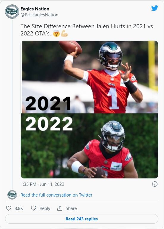 Posted June 16, 20223 yr Eagles’ Jalen Hurts Stunningly Compared to All-Pro QB: ‘It Just Happens’ By Mike Greger Updated Jun 13, 2022 at 10:37am Getty Philadelphia Eagles QB Jalen Hurts. Franchise quarterbacks don’t grow on trees. Everybody knows that. They need time to mature, time for the roots to take shape underneath the ground. Jalen Hurts is in the germination stage of his journey. The Philadelphia Eagles quarterback is entering his third NFL season, his second as a full-time starter. Hurts’ numbers have steadily risen since taking the reins. More importantly, they look very similar to what Buffalo Bills quarterback Josh Allen did in 2018 and 2019. Allen took the leap into elite status in Year 3, a random fact not lost on Eagles owner Jeffrey Lurie. "It’s very, very difficult to project what you call or what we might call franchise quarterback,” Lurie told reporters on March 29. "It happens. It just happens. After Year 1 or Year 2 was Josh Allen a franchise quarterback? Was he even thought to be a franchise quarterback when Buffalo drafted him? "I think the answers are very clearly no, no and no. He developed into one, so now we have a young, 23-year-old, playoff quarterback who gets better every year in college, and in the pros, he’s had really one full year.” Lurie continued: "No one knows where that’s going to end up. But I think what you do know is you have a guy that is incredibly dedicated. Excellent leader of men — players around him gravitate to him. He will do anything and everything to get better and work on every weakness he has and try to maximize every strength he has. That’s why we’re committed to Jalen at age 23. Who knows what the future holds, right? So that’s where it goes.” Hurts Getting ‘More Comfortable’ in Eagles’ Offense Head coach Nick Sirianni challenged Hurts to work on his fundamentals in the offseason. He did. He showed up to OTAs looking more comfortable in the pocket and throwing a crisper ball. Hurts has also benefited from working with the same offensive coaching staff for a second straight season. That has happened to him since high school. "Jalen is, in my opinion, more comfortable in the offense, right. That’s just the part of the process the second year,” Sirianni said. "He knows where the receivers are going to be versus different looks. He knows where to go with the football a little bit quicker.” The next stage in Hurts’ growth is getting reps. He needs to build chemistry with his revamped receiving corps, highlighted by the additions of A.J. Brown and Zach Pascal. "We’ve done our job as coaches,” Sirianni said, "and I don’t want to say we’ve done a good job, but what we’ve done as coaches is figured out what he likes and what he’s good at and all these different things. It’s just accumulating those reps.” Public Practices Tickets on Sale: August 7 The Eagles will hold an open training camp practice for the general public on August 7 at Lincoln Financial Field. Tickets are $10 and all proceeds benefit the Eagles Autism Foundation. There is also a $25 VIP option that allows fans a special on-field experience. https://heavy.com/sports/philadelphia-eagles/jalen-hurts-josh-allen/
