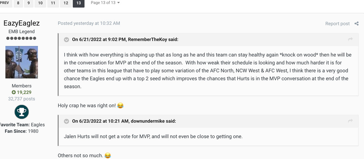 So when you think about it, the people that didn't want to give Hurts a 3rd season weren't a whole lot different than you when it came to JJAW. They didn't like what they saw from his first two seasons and were convinced their opinion was right and went "all in" with their arguments about the player heading into his 3rd year. JJAW ultimately failed (here) which did validate your predictions. Hurts has done the opposite. Ultimately, their outcomes are on the "player" not the "fan."