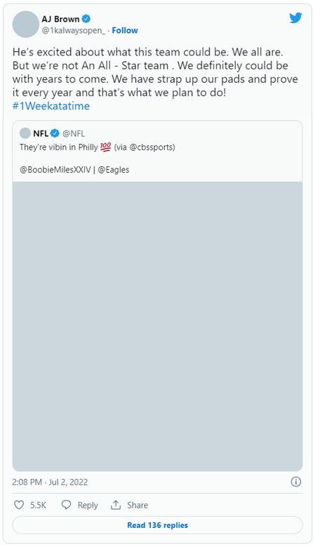Posted July 6, 20223 yr Eagles Pro Bowler Fires Back at ‘Excited All-Star’ Teammate By Mike Greger Updated Jul 3, 2022 at 1:50pm Getty Miles Sanders and Jalen Hurts were both limited participants heading into Week 15 against Washington. Miles Sanders caused quite the stir when he referred to the 2022 Philadelphia Eagles as an "All-Star Team” during a recent interview with CBS Sports. It was an innocent comment from an excited player that took on new life when compared to some similar thoughts made in 2011. That 2011 "Dream Team” never lived up to the hype. And people were quick to attack Sanders for labeling this year’s squad an "All-Star Team.” Pro Bowl receiver A.J. Brown took to Twitter to pipe down Sanders’ comments, brushing it off as an overexcited teammate offering a misguided opinion. Unlike teammate Nakobe Dean, Sanders wasn’t talking about winning multiple Super Bowls but his words were being used as bulletin board material across the NFC East. The Dallas Cowboys might have something to say about it. Meanwhile, Sanders tried to downplay his comments while taking a shot at the pot-stirring media. "Oh man. We all feel like we’re on an all-star team, so we feel great,” Sanders told Cody Benjamin. "We feel unstoppable, I’m not gonna lie. The vibes are great, always have been. Nick Sirianni is doing a great job just keeping the vibes right, the chemistry good. We compete a lot in practice. But we’ve gotta see. Its gonna come down to camp, taking it one day at a time … putting everything together.” Sanders Sounds Off on Jalen Hurts Sanders was pretty open about his expectations when he met with reporters during spring practices. He called the 2022 Eagles a "great team” at the time while acknowledging they needed to put "all the pieces together.” The starting running back also described the great strides taken by quarterback Jalen Hurts. "The thing about Jalen is he’s always even Stephen, you can’t really tell but he handles himself very well, and I love how he leads the team,” Sanders told reporters on May 11. "You know, he’s always talking and trying to do stuff or give ideas, to see certain stuff we can do to make us better. "He’s always hitting receivers up. I know he throws with receivers at different times, whenever, people don’t even know. He does a lot of work behind closed doors and that’s what I love about him and, at the end of the day, he’s a great leader and I think a great guy for this city and this team.” Haason Reddick Poised for First Pro Bowl? NFL Media’s Nick Shook compiled a list of 32 first-time Pro Bowlers in 2022, picking a rostered player for all 32 teams. He selected pass-rushing linebacker Haason Reddick for the Eagles. Reddick has 31 career sacks in five NFL seasons, including 23.5 sacks over his past two years during stints in Carolina and Arizona. Shook wrote: "He’s grown into the player Arizona envisioned it was selecting with its first-round pick in 2017, and if he follows this track through another season, it’ll be hard to ignore his candidacy for postseason recognition.” https://heavy.com/sports/philadelphia-eagles/aj-brown-miles-sanders/