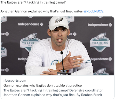 August 6, 20223 yr Gannon "explains" why the Eagles don't tackle in camp. I understand- I learned to master the guitar by just staring at it, not actually playing it. https://twitter.com/NBCSPhilly/status/1555920412755857408?s=20&t=lQ0ANDmW-HZC5prkh7KQdw