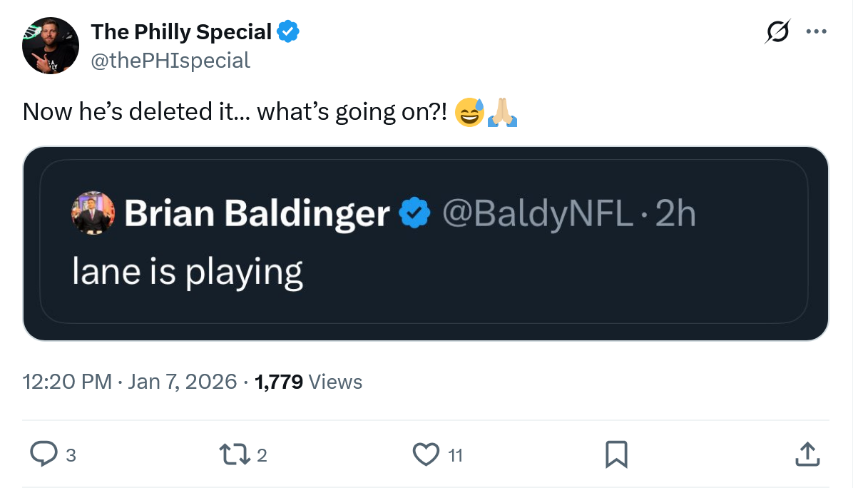 January 7Jan 7 12 hours ago, Procus said:You know in TATE, I posted a clip of Baldy saying he didn't think Lane Johnson would be playing on Sunday, and apparently he and Lane are tight. You'd think the boards would light up. Nothing. But post material about Obama in CVON and everybody has some reaction.11 hours ago, Procus said:No, I'm talking about the SF game dummy.Brian Baldinger: Lane Johnson is playing in Eagles vs. 49ersNice work Nostradumbass
