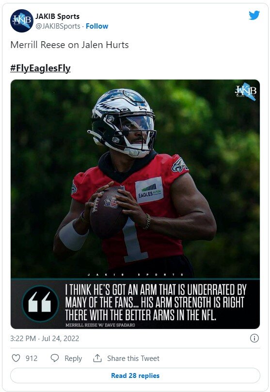 Posted July 28, 20223 yr Eagles' announcer Merrill Reese on Jalen Hurts: His arm strength is right there with top QB's Glenn Erby July 25, 2022 12:58 pm ET Much has been made about Jalen Hurts’ and his perceived lack of arm strength. One of the biggest concerns about Hurts’ future with the franchise stems from the perception that the third-year quarterback lacks the big-time arm strength needed to leaded Philadelphia back to postseason prominence. Over his first two seasons, Hurts has averaged 12.3 yards per completion, the 3rd-highest average in the NFL since 2020 among QBs with a minimum of 500 attempts (behind DeShaun Watson’s 12.6 and Jimmy Garoppolo’s 12.4), according to Reuben Frank. Hurts has the 3rd-highest average by any Eagles quarterback in the last 50 years (behind Michael Vick’s 12.9 and Ron Jaworski’s 12.9) per Frank. Head coach Nick Sirianni previously gave Hurts’ arm strength a vote of confidence, and now a legendary broadcaster has also weighed in. Merrill Reese told Dave Spadaro that Hurts’ arm strength is on par with some of the top passers in the NFL. Hurts doesn’t have to have the strongest arm, and if he can show improved accuracy and decision-making, the doubts should start to quiet down. Improved anticipation and ball delivery could catapult Philadelphia to the top of the NFC playoff picture. https://theeagleswire.usatoday.com/2022/07/25/philadelphia-eagles-news-merrill-reese-jalen-hurts-arm-strength-nfl-quarterbacks-josh-allen/