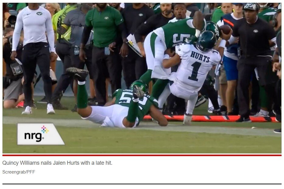 Posted August 13, 20223 yr Quincy Williams’ late hit enrages Eagles, Jets: ‘Egregiously awful’ By Brian Costello August 13, 2022 2:11am PHILADELPHIA — The Jets only can hope that linebacker Quincy Williams got his boneheaded moment of the season out of the way early. Williams hit Eagles quarterback Jalen Hurts out of bounds on a third-down play in the first quarter Friday night that drew a penalty flag and the ire of Eagles coach Nick Sirianni. On third-and-5 at the Jets’ 35-yard-line, Hurts scrambled toward the Jets’ sideline. He clearly was out of bounds when Williams drilled him. Sirianni was incensed and walked onto the field almost to the numbers, screaming in the direction of the Jets sideline and head coach Robert Saleh. Hurts was not injured and continued the drive, which ended with him throwing a 22-yard touchdown to Dallas Goedert. Saleh was not happy with Williams and said he spoke to Sirianni after the game, a 24-21 Jets win, about the play. "Egregiously awful by Quincy,” Saleh said. "He knows that. He knows better. Those are the plays Quincy has to get out of his game if he wants to become the linebacker that we all think he can be.” https://nypost.com/2022/08/13/quincy-williams-late-hit-enrages-eagles-jets-egregiously-awful/