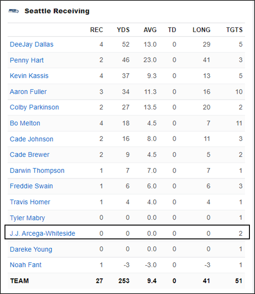 August 19, 20223 yr Let's check out JJAW's first preseason box score with the Seahawks: Wow, two targets and zero receptions. He's in midseason form already!