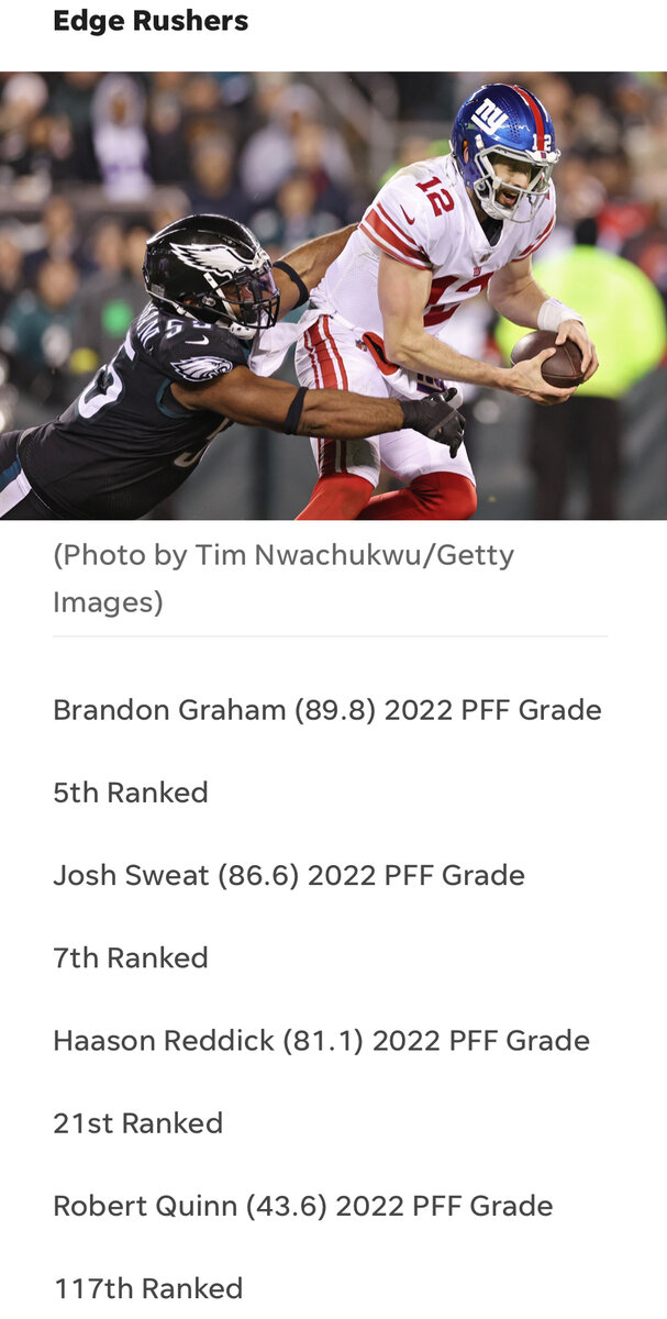 January 13, 20232 yr PFF ranking Sweat and BG over Reddick. People actually pay money for this trash. Don’t get me wrong both Sweat and BG have been outstanding this year, but seriously Reddick 21st ranked??? People were wanting him to be a finalist for DPOY yet PFF doesn’t even have him as the second best pass rusher on his own team. This might be a bit worse considering where they ranked Blankenship over CJGJ. Cue @brkmsn to tell me how correct this hot garbage is. 😂