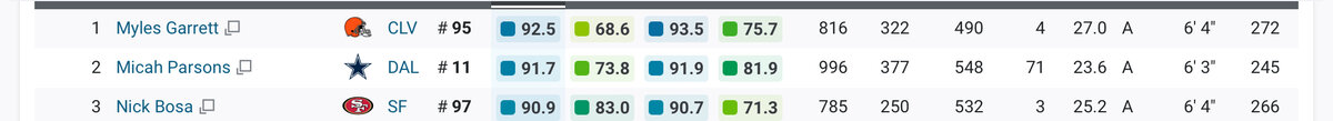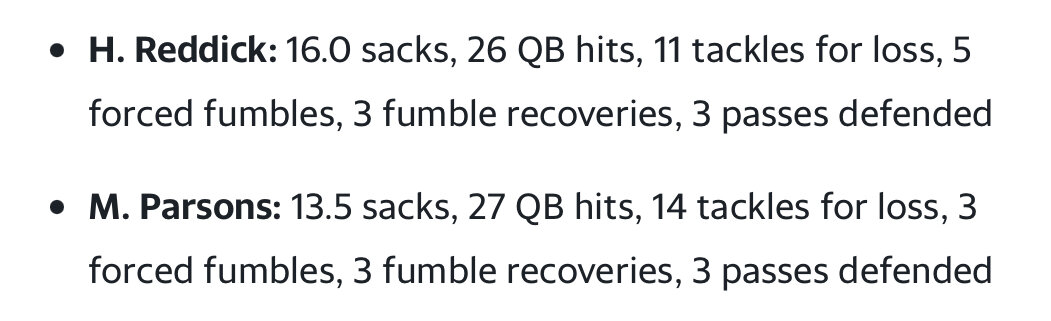 January 22, 20232 yr @brkmsn here are the stats for the season for both Reddick and Parsons. Accordint to PFF though one guy is to three in their rankings. This is why they’re trash. It’s completely based in nothing but their bias. Parson’s numbers are highly comparable to Reddick, but one guy is in the twenties while the other is in the top three. Total crap.