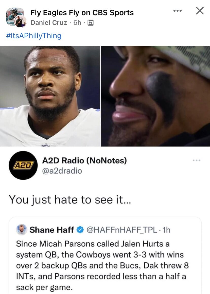 January 23, 20232 yr Just now, EazyEaglez said: Parsons is a different type of player than Reddick. He’s one of the best, but that doesn’t mean he’s light years better than Reddick. Reddick is elite at what he does. You don’t have to keep making PFFs case. You chose to do that. I have an issue with them and you chose to be their defender. You say take it up with them, but I never wanted you to take up their defense from the beginning. 😂 like I told you my opinion of them will not change. You're a lot like EagleVA in that. You made up your mind years ago and any attempt to explain how something works, you ignore it. PFF never said he was light years ahead as a pass rusher. They did say Parsons was a better run defender, that is all. Their pass rush grades are nearly identical. I'll say it one more time so you can ignore it one more time, but pff doesn't grade on stats. It's really not hard to understand, but for some reason, you just can't grasp it.