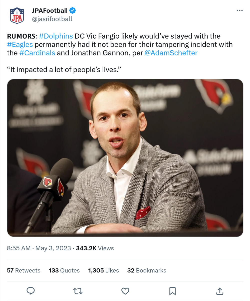 April 29, 20232 yr Author After hearing about the lying and cheating about Gannon's communications with the Cards prior to the Super Bowl, you have to wonder if the Eagles might have won the whole damn thing if they bit the bullet and canned Gannon's ass and replaced him with Fangio early on