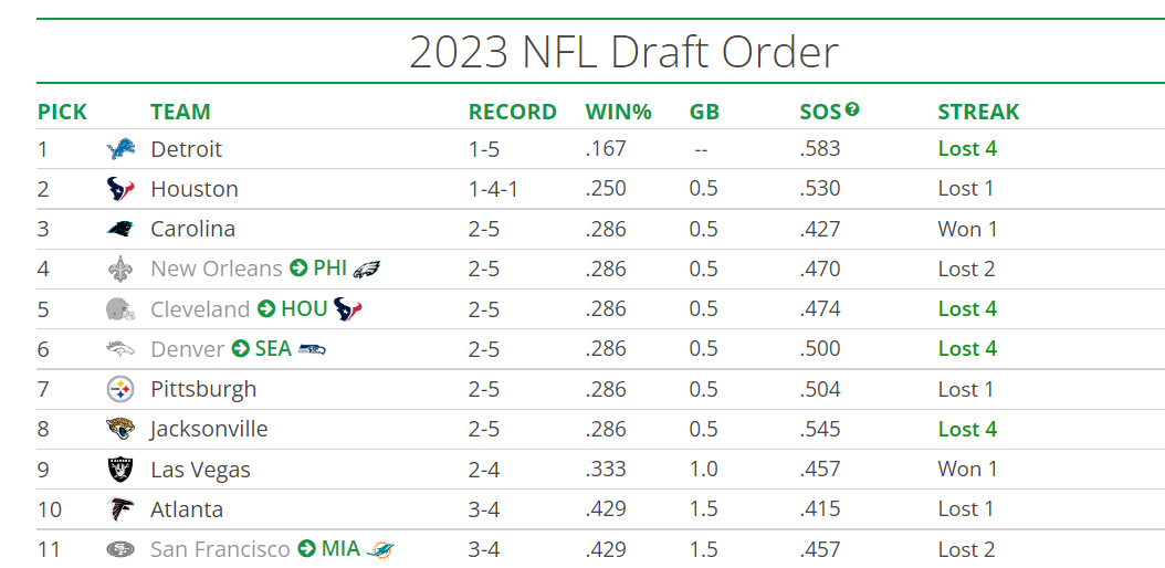 October 18, 20223 yr Chargers win...Cleveland's strength of schedule improves...the Saints pick moves back to #5. Rooting strategy....it's not very likely that the Panthers get to a better record than the Saints'...so it's best that they have a horrible record that weakens the Saints' SOS...a weaker SOS moves the Saints' pick up, as it's the first tie breaker. Root against the Panthers (not that hard).