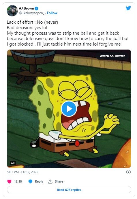 Posted October 4, 20222 yr Brown explains why his tackling effort looked so weak It certainly wasn't A.J. Brown's fault when Jalen Hurts made a bad decision and tried to squeeze a late pass into a non-existent window, resulting in a first-quarter interception by the Jaguars. But it might've been Brown's fault that the interception wound up in the end zone. Andre Cisco returned the interception 59 yards to put the Jags up 7-0 early in Sunday's game, but upon further review it seems Brown had quite an opportunity to prevent the score during the INT return. Watch the replay below and decide for yourself: [NOTE: click on link to article below to view video] It sure seems like Brown had a pretty good chance to tackle Cisco, or at least try to tackle Cisco, at the 45-yard line and just... didn't? Eagles fans were none too pleased with the effort: Maybe there's something we're all missing here, but it sure seems like Brown is gonna have to explain that one. UPDATE: He explained it! Brown took to Twitter after Sunday's win and offered up an explanation, and a mea culpa, about the play: Got it. I like the thought process - getting the ball back would've indeed been clutch right there - but sometimes you just have to make the smart play, get the guy down, and move on to the next one. Respect to A.J. for owning what he admitted was a "bad decision" and also for asking for forgiveness from the fans. The guy seems to get it. Also, as long as he's putting up stat lines like he did on Sunday and continues to ball out, fans are going to be very willing to forgive just about any mild transgression. Brown has 25 catches for 404 yards and a TD through four games and has looked like one of the most dominant wideouts in the NFL. Case closed. https://www.nbcsports.com/philadelphia/eagles/eagles-aj-brown-explains-his-tackling-effort-jaguars-int-return