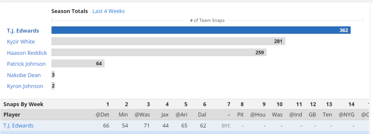 October 25, 20222 yr On 10/21/2022 at 10:36 AM, Mike31mt said: I think we'll see more of Dean as the season wears on. Just a hunch Edwards will get exposed, he had a rough game vs the Cowboys MILB TJ Edwards recorded 14 tackles (six solo) and one pass defense in the win over the Dallas Cowboys - Rotowire - October 12, 2022 ----------------- That would make the most tackles TJ Edwards has had in a single game this season. Qb ratings this season for TJ Edwards 56.9 --------------------------------- Nakobe Dean played 20 snaps against Dallas TJ Edwards played 65 snaps against Dallas TheEaglesWire - USA Today - October 17. 2022 6:31am EST -------------------- Photo below - Rotowire
