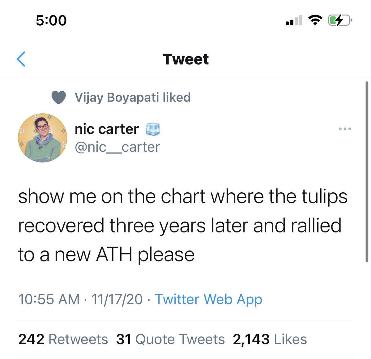 November 17, 20205 yr Technically it hasn't rallied to a new all time high, but I agree with the overall sentiment. Critics who were calling crypto the next fad like beanie babies, baseball cards, etc, sure have been awfully quiet lately.