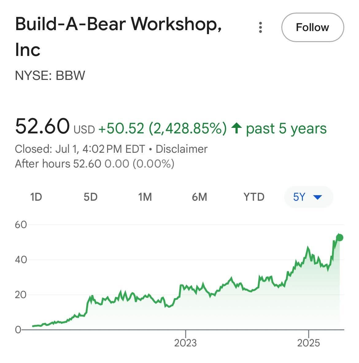 July 5, 2025Jul 5 9 hours ago, iladelphxx said:We must have read the same article last night. I just read about his. It was like $2.50 and went to 52. My question is, did anyone actually get rich off this stock? How weird would you have to be to buy a ton of build a bear shares? Who believes in this company so much? Any time I see one, its empty. People shopping in Wilkes-Barre wal mart are not going and spending 50 dollars on a teddy bear on the way out the door.