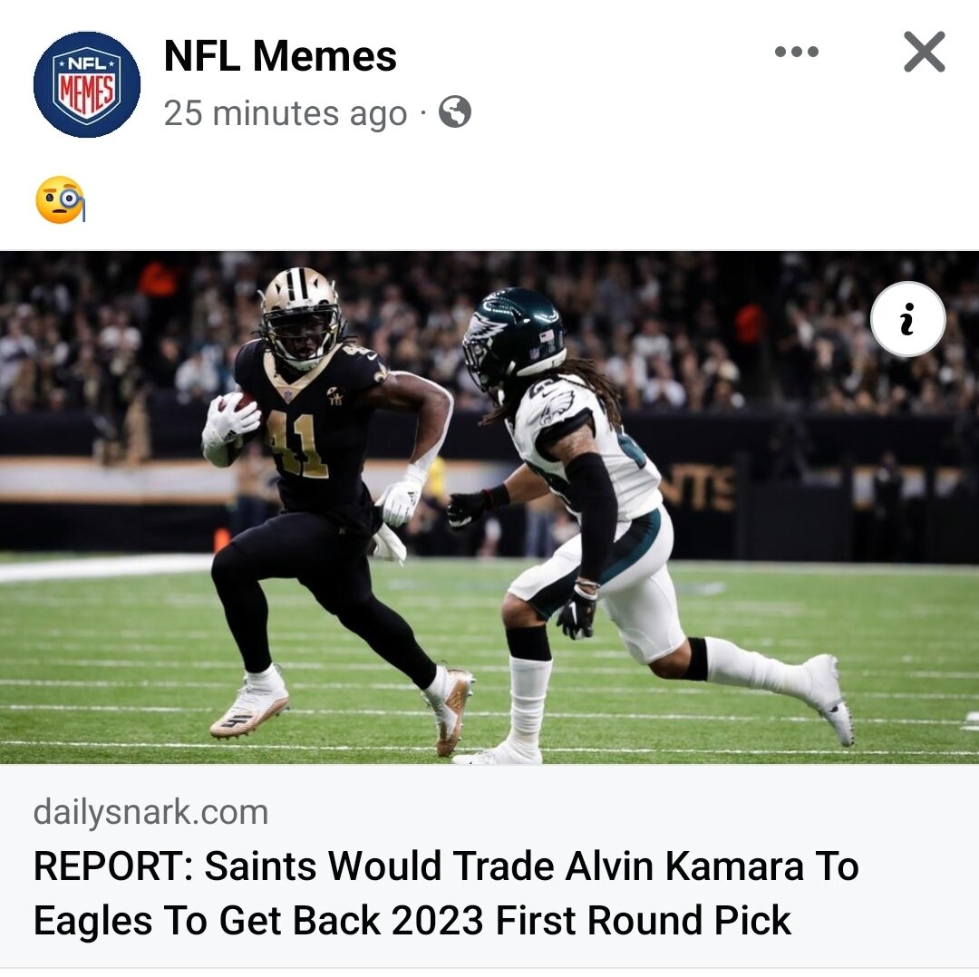 October 28, 20222 yr The Eagles would never fork over a high pick for a RB in the draft, let alone on the open market.Ā Especially somebody who's facing a suspension or worse.Ā Kamara is staying where he is.
