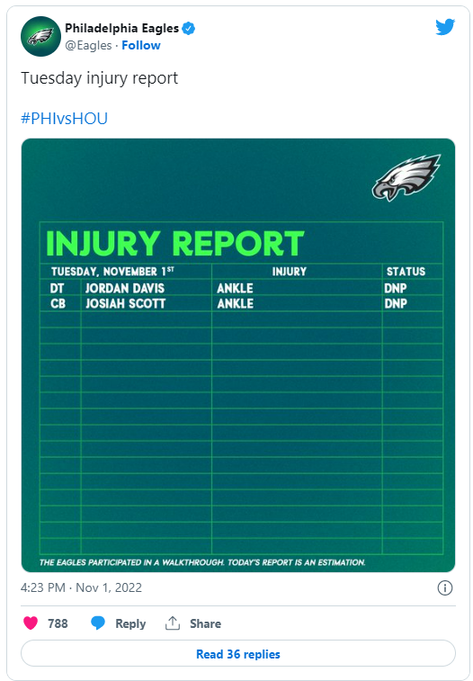 Posted November 2, 20222 yr EAGLES INJURY REPORT: TWO PLAYERS SIT OUT TUESDAY’S PRACTICE AFTER SUSTAINING INJURIES IN WEEK 8 By Brian Cass November 1, 2022 After notching their seventh win on Sunday, the Eagles will be back at it this Thursday night down in Houston. With such a quick turnaround, the team released their first injury report of the week on Tuesday. Two players appeared on today’s injury report from the team. Eagles Tuesday Injury Report: DT Jordan Davis (ankle) – DNP CB Josiah Scott (ankle) – DNP Both Davis and Scott were carted off the field during Sunday’s contest against Pittsburgh. Davis reportedly suffered a high ankle sprain and will likely miss four to six weeks of action. The team hasn’t confirmed the diagnoses just yet, but all signs are pointing towards a lengthy absence for the first-round defensive tackle. The team has a bevy of defensive tackles to work with. It’ll be up to Jonathan Gannon to mix and match his personnel to help mitigate Davis’ absence, especially in the running game. As for Scott, the severity of his injury is not yet clear. Even if it’s not a serious injury, the probability of the nickel corner being ready to go by Thursday night is low. Thankfully, the entire starting secondary is healthy entering Week 9. Aside from Davis and Scott, Philly looks like they’ll be completely healthy when they suit up for their Thursday night contest against the Texans. https://thelibertyline.com/2022/11/01/eagles-injury-report-2/